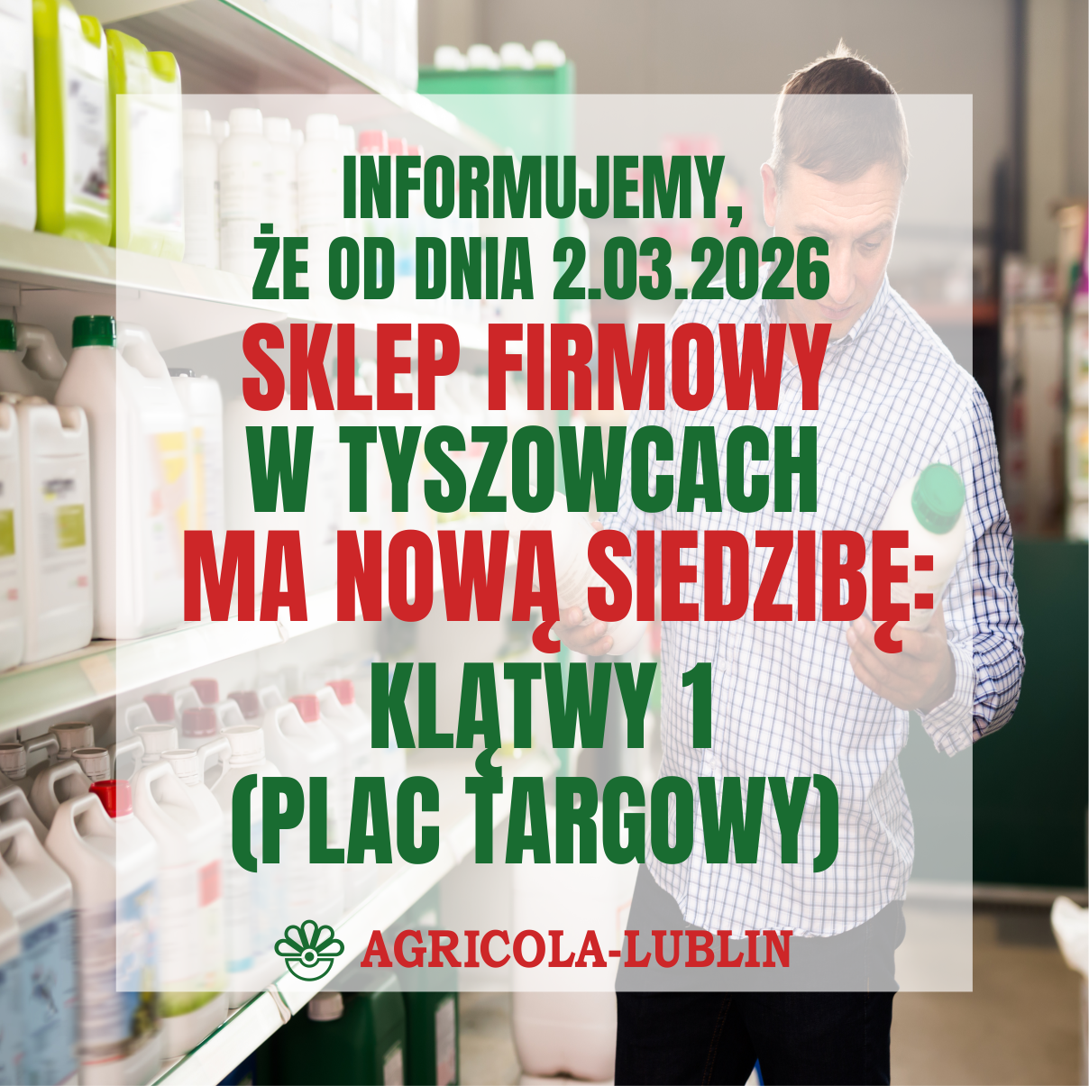 Informujemy, że od dnia 02.03.2026 sklep firmowy w Tyszowcach zostaje przeniesiony do nowej siedziby w miejscowości Klątwy 1 (plac targowy w Tyszowcach). Numery telefonów i godziny otwarcia sklepu pozostają bez zmian.