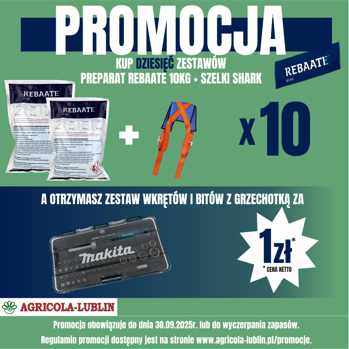 Kup 10 sztuk zestawu Rebaate 10kg + szelki Shark do dnia 30.09.2025r. potwierdzonych dowodami zakupu (fakturami i paragonami), a otrzymasz możliwość zakupu zestawu wkrętów i bitów z grzechotką Makita z logo Agricola-Lublin Sp. z o.o za 1 zł netto.